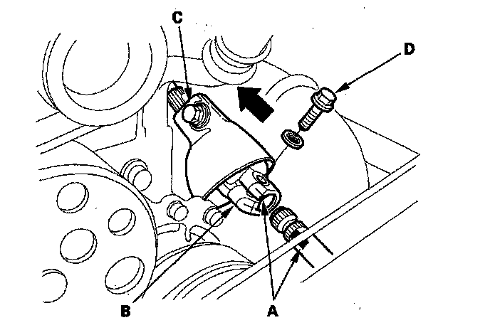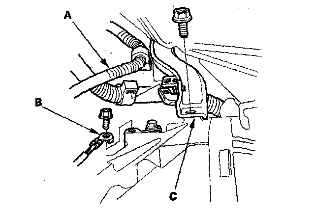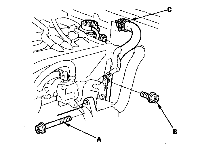 19. '00-05 models: Remove the upper starter motor mounting bolt (A) and upper intake manifold bracket mounting bolt (B). Disconnect the hose (C) from the suction valve.
