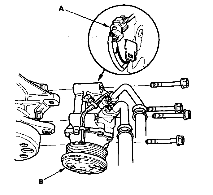 16. Disconnect the 1P connector (A), then remove the four mounting bolts and the A/C compressor (B). Hang the A/C compressor from the body with a piece of wire.