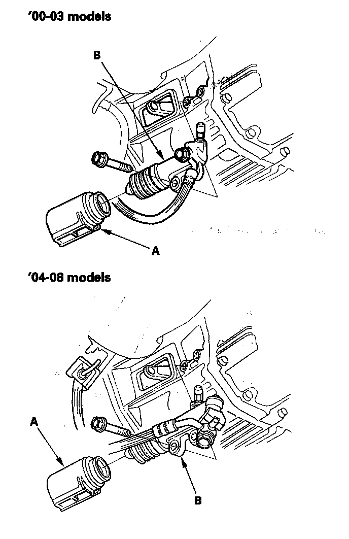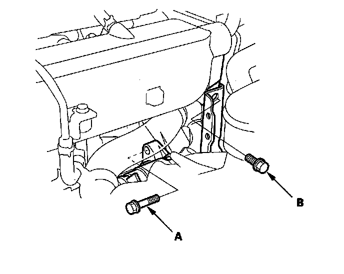 20. '06-08 models: Remove the upper starter motor mounting bolt (A) and upper intake manifold bracket mounting bolt (B).