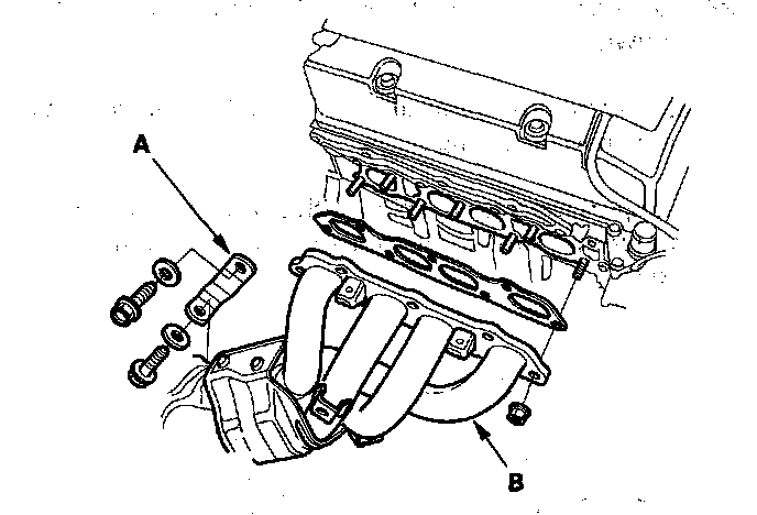 31. Remove the exhaust manifold bracket (A) and the exhaust manifold (B).