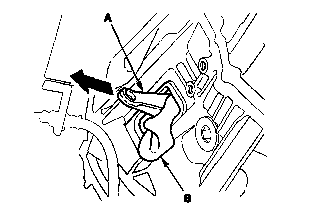 35. Pull out the release fork (A) from the release fork hanger. Wedge a shop towel (B) between the opening in the clutch housing and the release fork to hold the release fork in place.