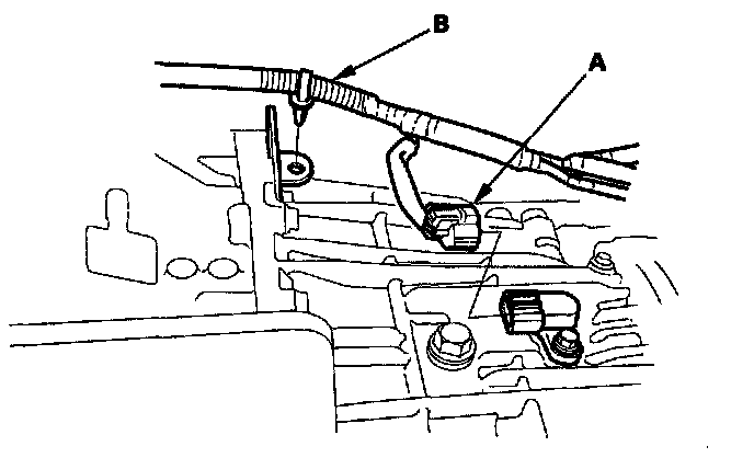 42. Lower the transmission. Disconnect the vehicle speed sensor (VSS) ('00-05 models) or the output shaft (countershaft) speed sensor ('06-08 models) connector (A), then remove the wire harness (B) from the transmission.