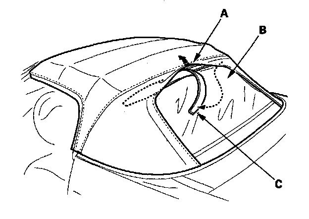 5. Lift the convertible top cloth (A) that overlaps the top of the rear window (B), and remove the patch (C) from the roof zipper.