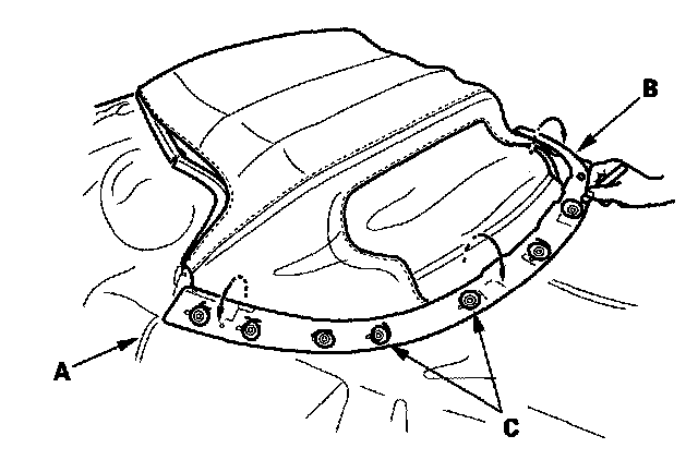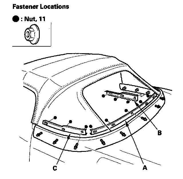 9. Remove the nuts, then remove the rear lower convertible top retainer (A), right side convertible top retainer (B), and left side convertible top retainer (C).