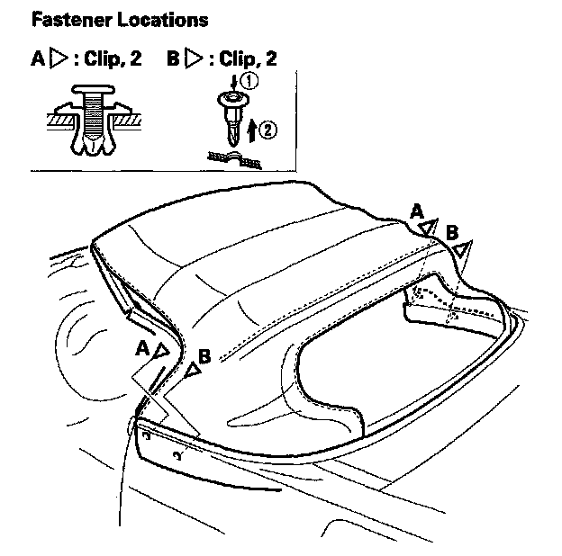 10. Open the roof half-way, and remove the clips (A, B) on each side of the top between the quarter panel and the roof.