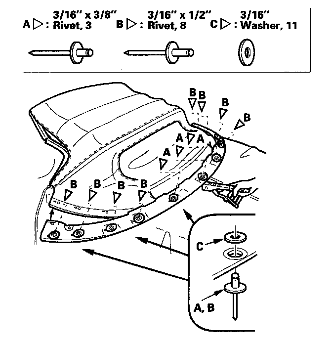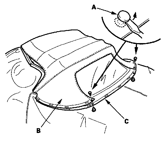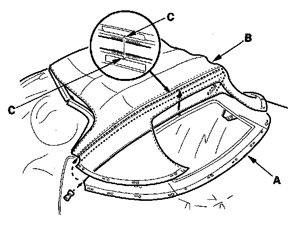 22. Secure the lower part of the rear window (A) to the lower part of the convertible top cloth (B) with new two-piece brass rivets (C).