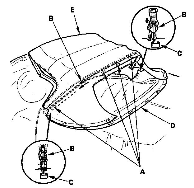 20. Turn the convertible top cloth (A) inside out, and apply a new patch (B) on the zipper (C). Make sure the alignment notches (D) align with the middle of the rear window (E).