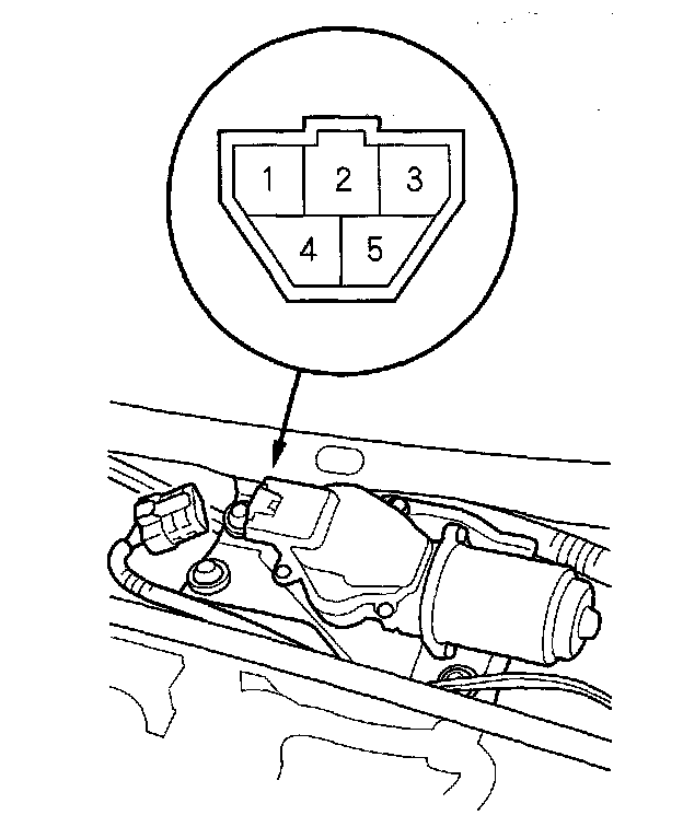 5. Connect the battery power to the No. 4 terminal, and ground to the No. 2 and No. 3 terminals of the 5P connector. Then connect an analog voltmeter between the No. 4 (+) terminal and the No. 5 (-) terminal. When the park switch contacts, the pointer should swing. If not, replace the motor.