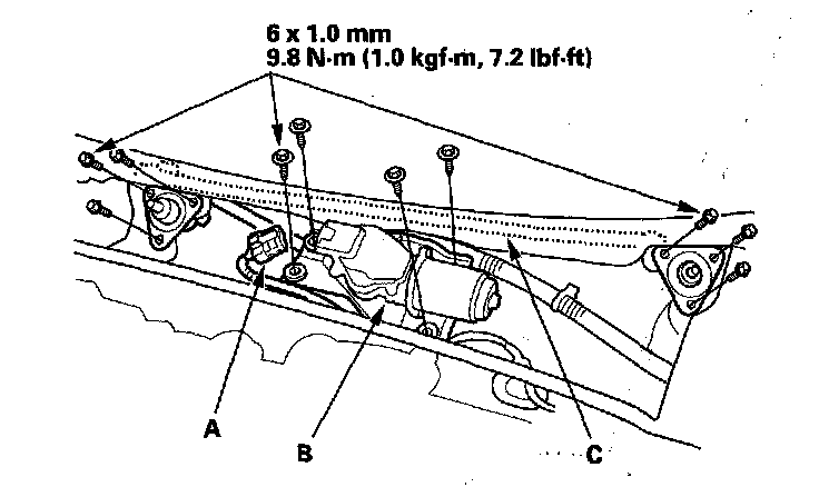 4. Remove the bolts, then remove windshield wiper linkage assembly (C).