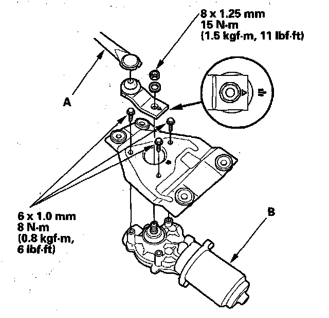 5. Remove the three mounting bolts and nut from the wiper linkage (A) to remove the wiper motor (B).