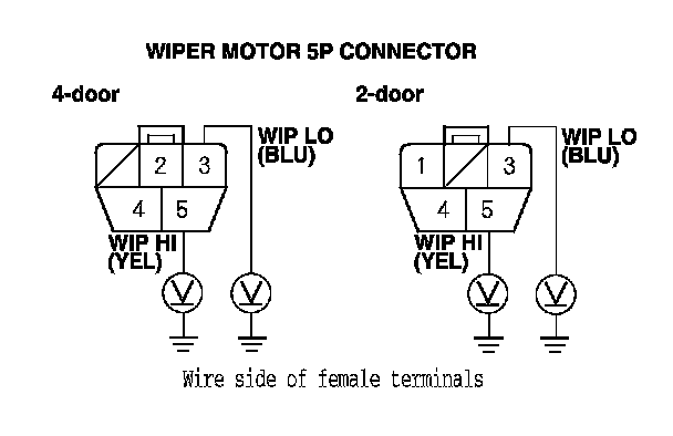 9. Measure the voltage between body ground and the wiper motor 5P connector terminal No. 3 with the wiper switch ON (Low), and measure the voltage between body ground and the wiper motor 5P connector terminal No. 5 with the wiper switch ON (High) respectively.