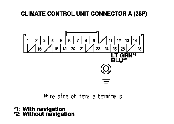 8. Check for continuity between climate control unit connector A (28P) No. 24 terminal and body ground.