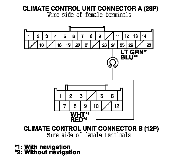 9. Check for continuity between climate control unit connector A (28P) No. 24 terminal and climate control unit connector B (12P) No. 10 terminal.