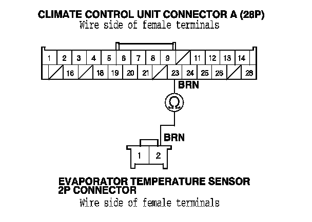 7. Check for continuity between climate control unit connector A (28P) No. 23 terminal and the evaporator temperature sensor 2P connector No. 2 terminal.