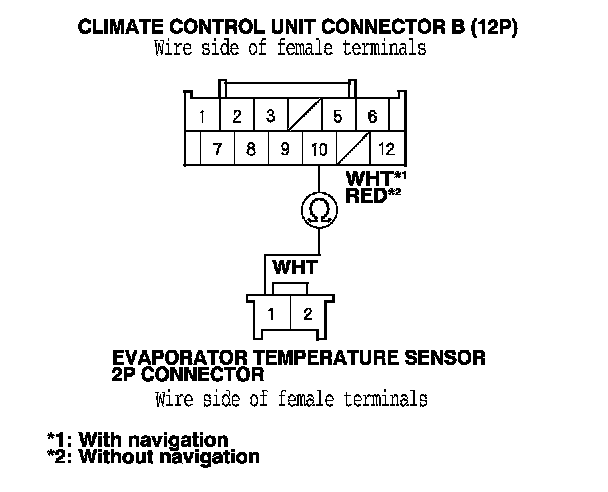 8. Check for continuity between climate control unit connector B (12P) No. 10 terminal and the evaporator temperature sensor 2P connector No. 1 terminal.