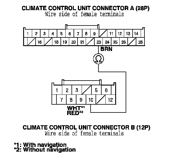 8. Check for continuity between climate control unit connector A (28P) No. 23 terminal and climate control unit connector B (12P) No. 10 terminal.