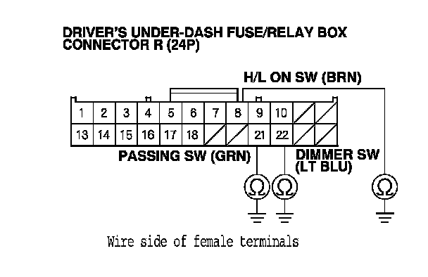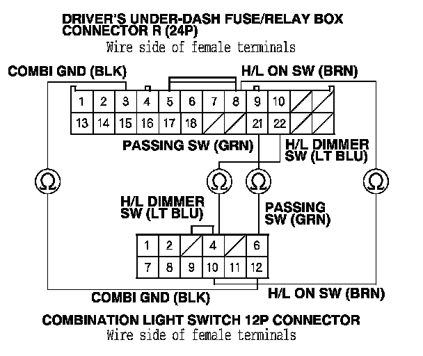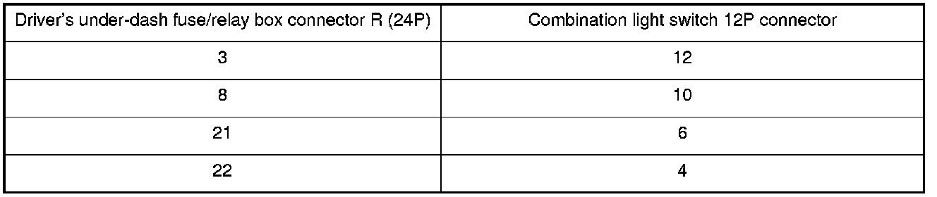 20. Check for continuity between the driver's under-dash fuse/relay box connector R (24P) terminals and the combination light switch 12P connector terminals as shown: