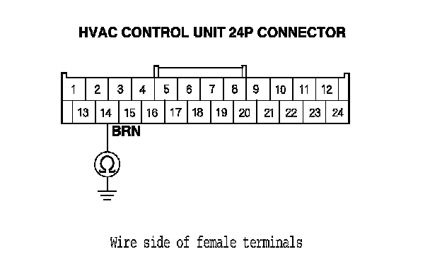 7. Check for continuity between body ground and the HVAC control unit 24P connector No. 14 terminal.