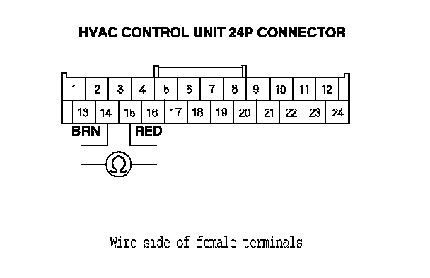 8. Check for continuity between the HVAC control unit 24P connector No. 14 and No. 15 terminals.