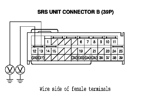 14. Measure the voltage between the terminal No. 12 of SRS unit connector B (39P) and body ground, and between the terminal No. 13 and body ground. There should be less than 0.2 V.