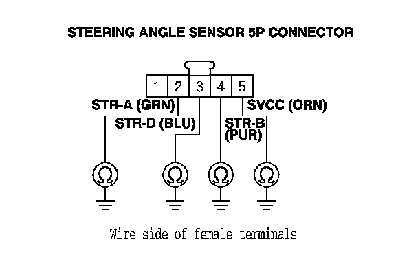 8. Check for continuity between body ground and steering angle sensor 5P connector terminals No. 2, No. 3, No. 4, and No. 5 individually.