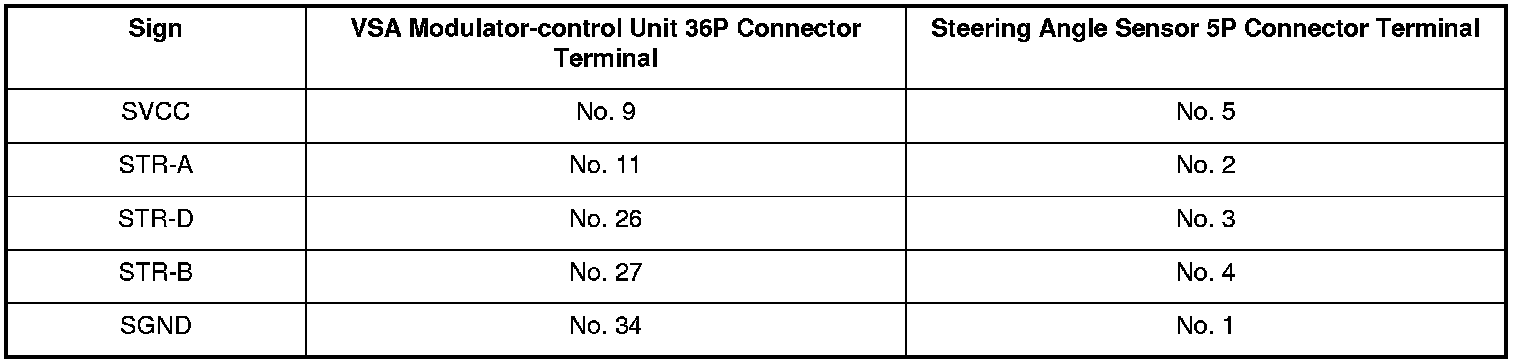 9. Check for continuity between the VSA modulator-control unit 36P connector terminal and the steering angle sensor 5P connector terminal individually (see table).