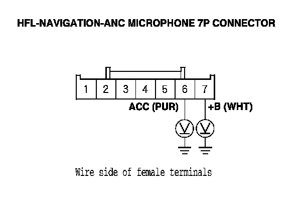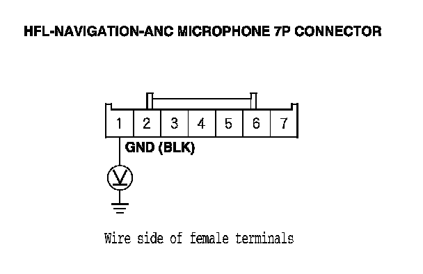 13. Measure the voltage between the body ground and HFL-navigation-ANC microphone 7P connector terminals No. 6 and No. 7 individually.