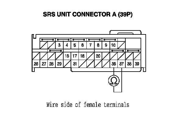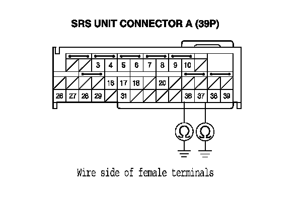 9. Measure the resistance between the terminals No. 36 and No. 37 of SRS unit connector A (39P). There should be an open circuit or at least 1 MOhms.