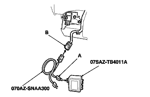 15. Connect the SRS inflator simulator (jumper connector) and the black lead (A) of simulator lead L to the left engine compartment wire harness 2P connector (B).