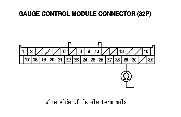 10. Measure the resistance between the terminals No. 29 and No. 30 of gauge control module connector (32P). There should be less than 1.0 Ohms.