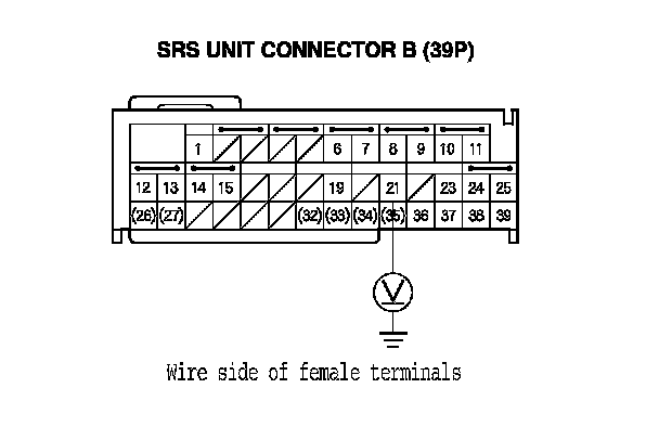 12. Measure the voltage between the terminal No. 21 of SRS unit connector B (39P) and body ground. There should be more than 10 V.