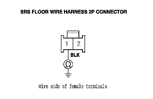 14. Measure the resistance between the terminal No. 1 of the SRS floor wire harness 2P connector and body ground. There should be less than 1.0 Ohms.