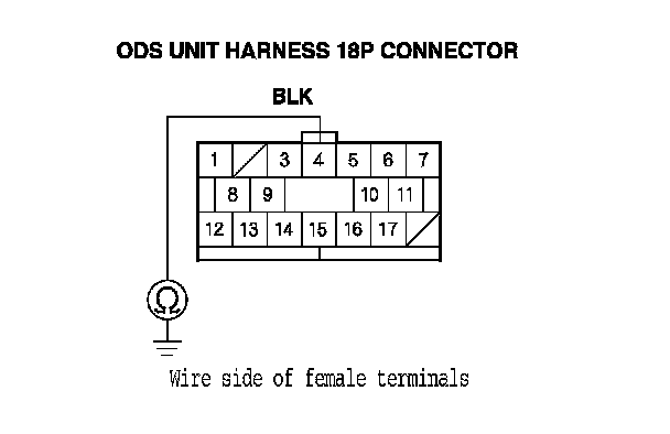 9. Measure the resistance between the terminal No. 4 of the ODS unit harness 18P connector and body ground. There should be an open circuit or at least 1 MOhms.
