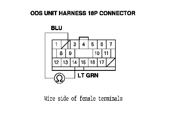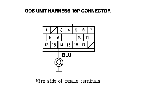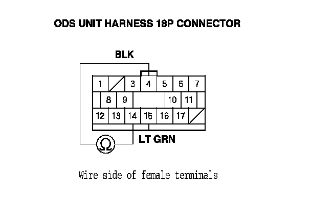 10. Measure the resistance between the terminals No. 4 and No. 14 of the ODS unit harness 18P connector. There should be an open circuit or at least 1 MOhms.