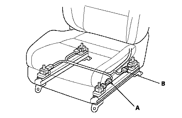 15. Disconnect the front passenger's weight sensor (front inner side) connector (A) and front passenger's weight sensor (rear inner side) connector (B).