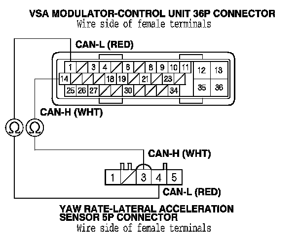 8. Check for continuity between the VSA modulator-control unit 36P connector terminal and the yaw rate-lateral acceleration sensor 5P connector terminal (see table).