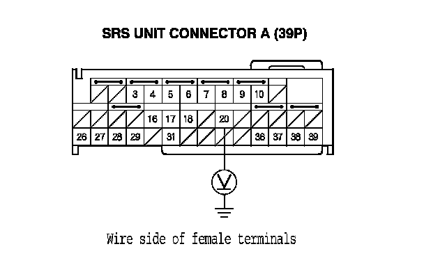 10. Measure the voltage between the terminal No. 20 of SRS unit connector A (39P) and body ground. There should be less than 0.2 V.