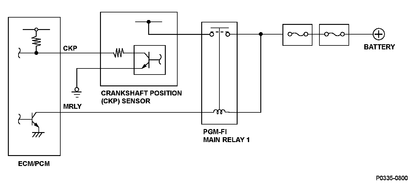 The crankshaft position (CKP) sensor consists of a rotor and a semiconductor that detects rotor position. When the engine starts, the rotor turns and the magnetic flux in the semiconductor device changes. The changes of magnetic flux are converted into pulsing signals to the engine control module (ECM)/powertrain control module (PCM). The CKP sensor detects injection/ignition timing for each cylinder and engine speed. If no pulsing signals from the CKP sensor are detected, a malfunction is detected and a DTC is stored.