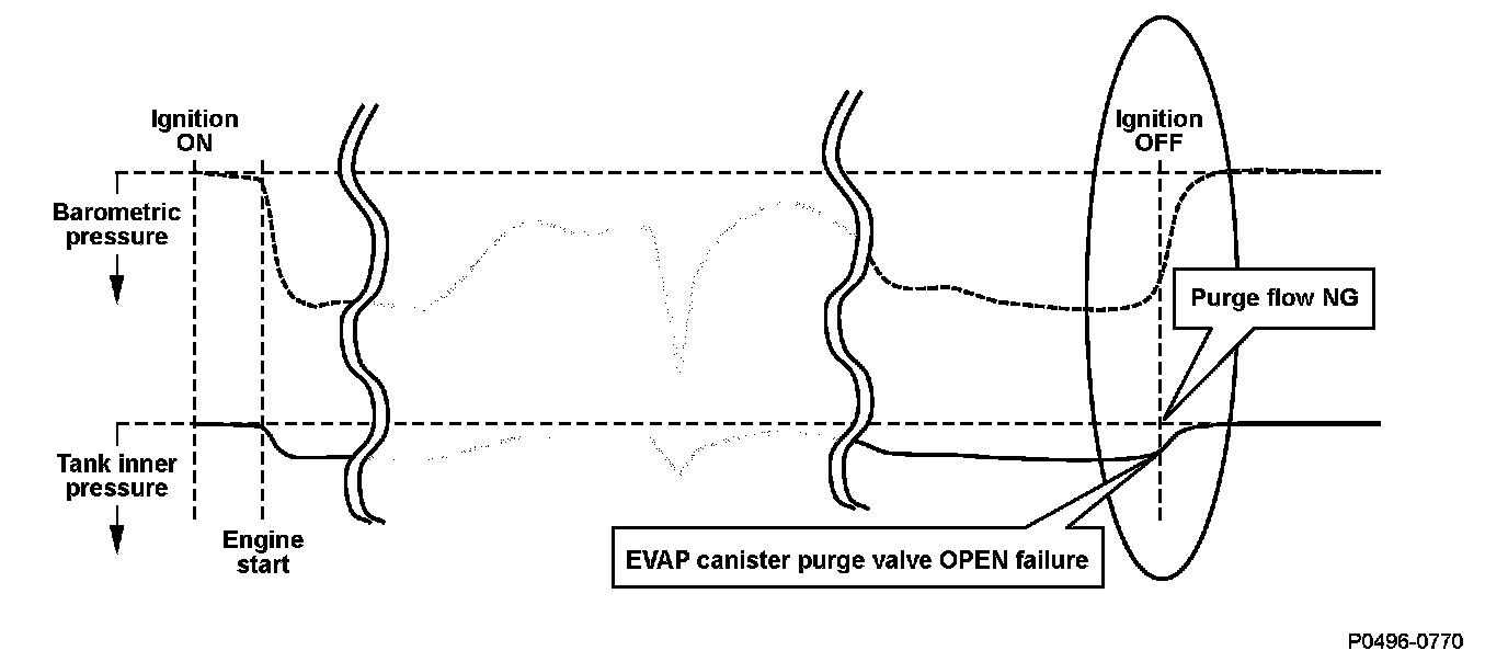 - Either purge flow P0497 abnormality or P0496 EVAP canister purge valve OPEN failure.