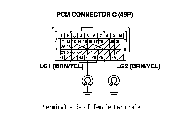 10. Check for continuity between PCM connector terminal C44 and body ground, and between terminal C48 and body ground.
