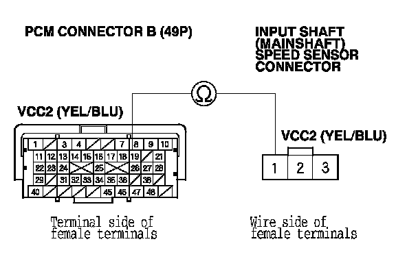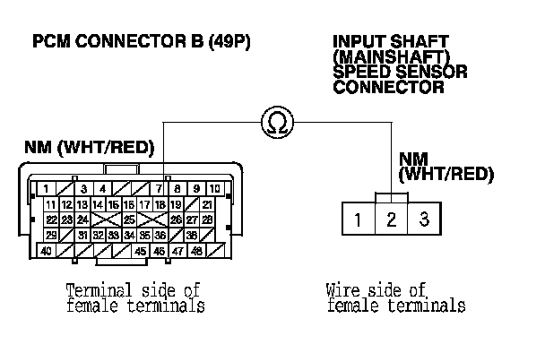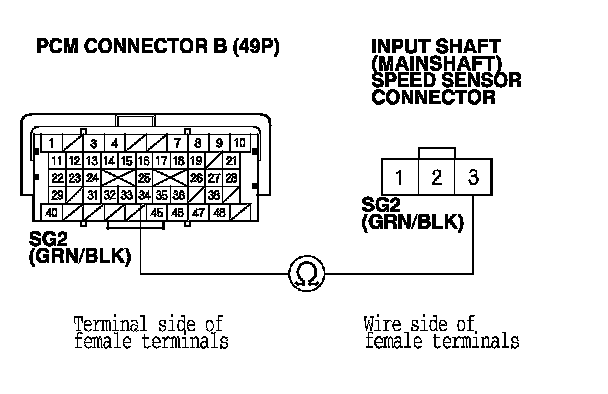 25. Check for continuity between PCM connector terminal B34 and input shaft (mainshaft) speed sensor connector terminal No. 3.