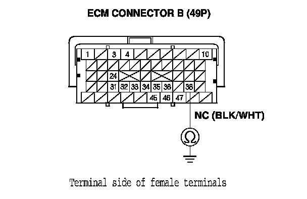 13. Check for continuity between ECM connector terminal B38 and body ground.