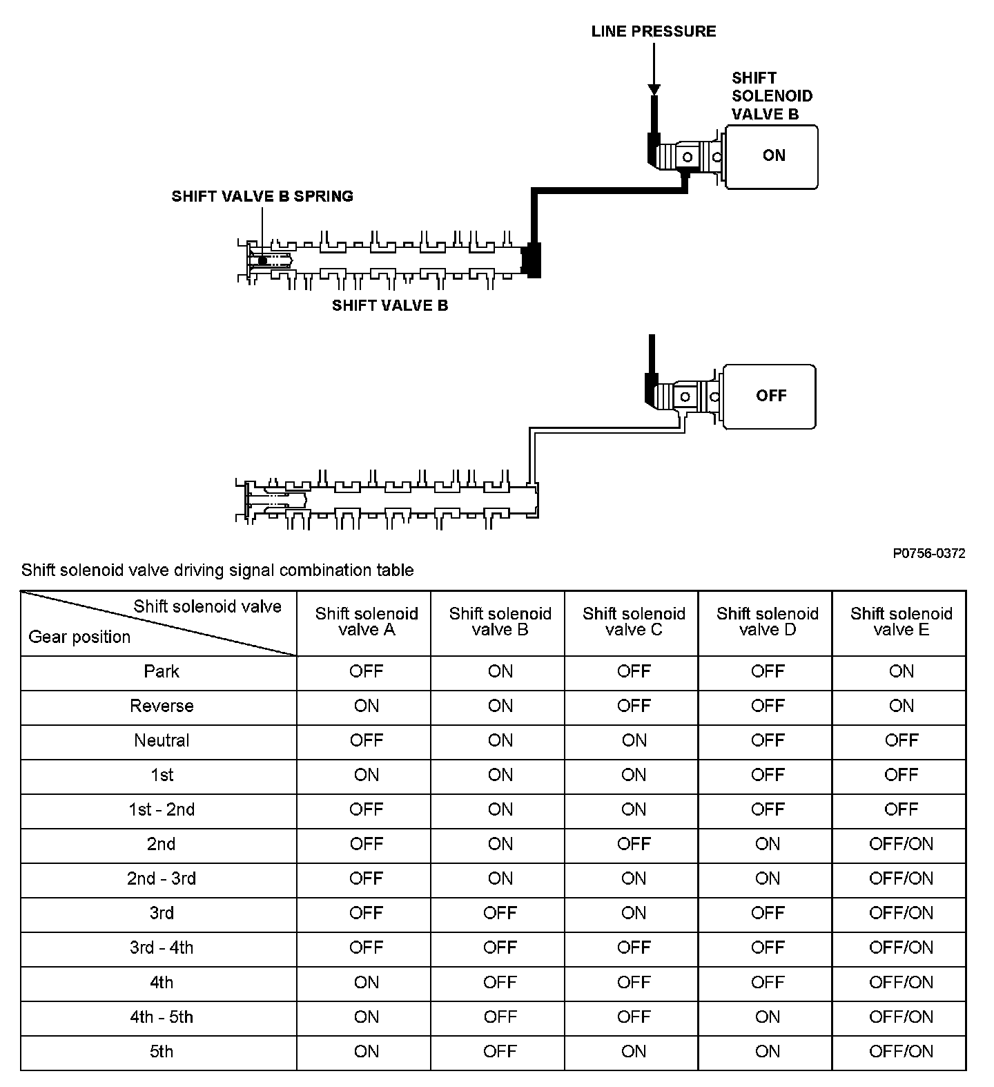 Shift solenoid valve B is installed in the transmission housing. It is controlled by the ON/OFF signal from the powertrain control module (PCM) to apply line pressure to shift valve B. The signal from the PCM is output to apply clutch pressure control pressure to the proper gear change clutch according to the gear change schedule. When the signal to shift solenoid valve B from the PCM is OFF, and line pressure is discharged, shift valve B is inactive. When the signal to shift solenoid valve B from the PCM is ON, and line pressure is applied to shift valve B, it operates against the shift valve B spring. The PCM monitors the mainshaft speed and the countershaft speed at the gear change determined by the shift schedule. When an improper gear ratio is output compared to the predetermined gear change mode, a shift solenoid valve B ON failure is detected and a DTC is stored.