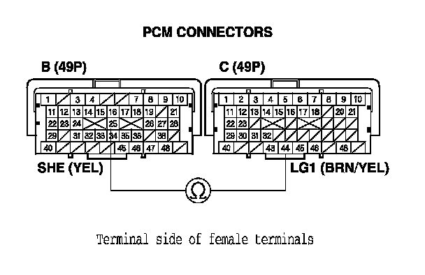 11. Measure the resistance between PCM connector terminals B25 and C44.