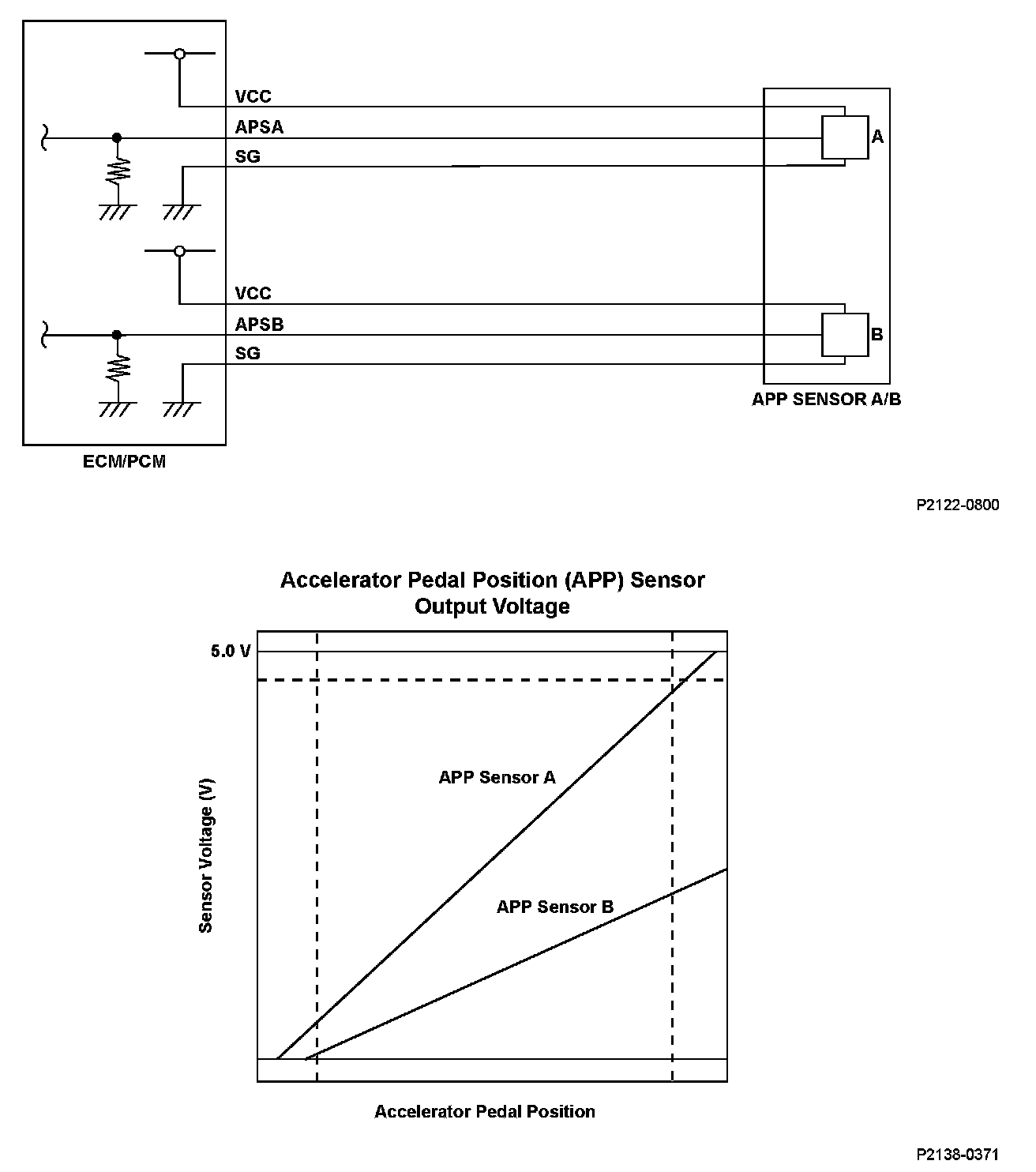 Accelerator pedal position (APP) sensor A and accelerator pedal position (APP) sensor B are potentiometers, and they are attached on the accelerator pedal. When the driver presses the accelerator pedal, the APP sensors A and B reacts and detects the accelerator opening value. The accelerator pedal opening value is converted to a signal in APP sensors A and B and transmitted to the engine control module (ECM)/powertrain control module (PCM) to compute the target position. The target position signal is then transmitted to the throttle actuator control module. APP sensor A is for the primary control, and APP sensor B is a back-up of APP sensor A in case it malfunctions. Both sensors compare their output voltage to each other for malfunction detection. When the voltage difference of APP sensor B is out of a fixed range for a set time, the ECM/PCM detects a malfunction, and a DTC is stored.