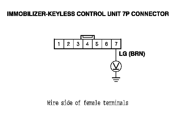 10. Back-probe and measure the voltage between the immobilizer-keyless control unit 7P connector terminal No. 7 and body ground.