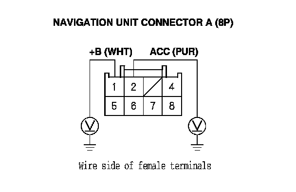 6. Measure the voltage between navigation unit connector A (8P) terminal No. 1 and No. 2 to body ground.
