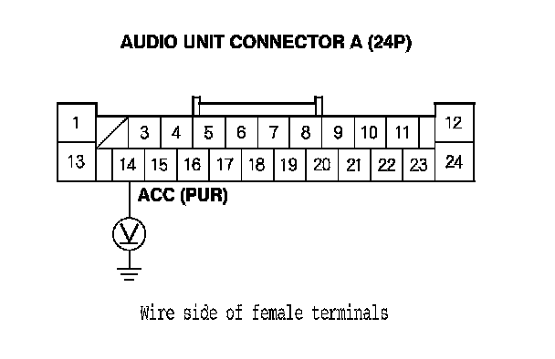 5. Measure the voltage between audio unit connector A (24P) terminal No. 14 and body ground.