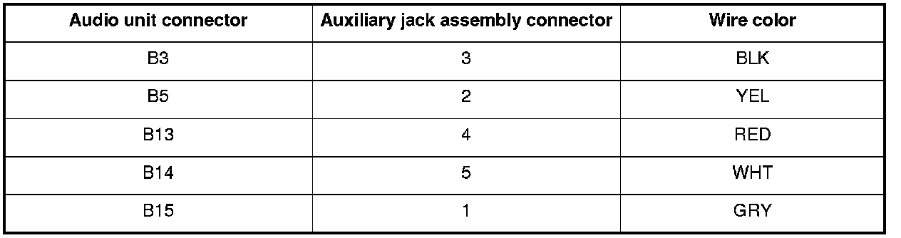12. Check for continuity between audio unit connector B (20P) and auxiliary jack assembly 5P connector according to the table.