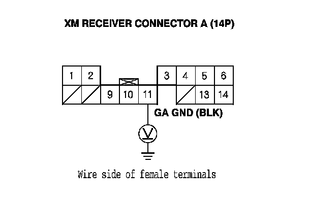 8. Measure the voltage between XM receiver connector A (14P) terminal No. 11 and body ground.